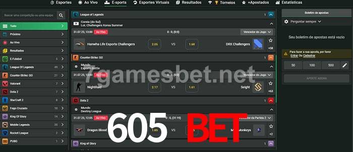 O 605 Bet oferece uma grande seleção de opções de apostas em e-sports com probabilidades competitivas